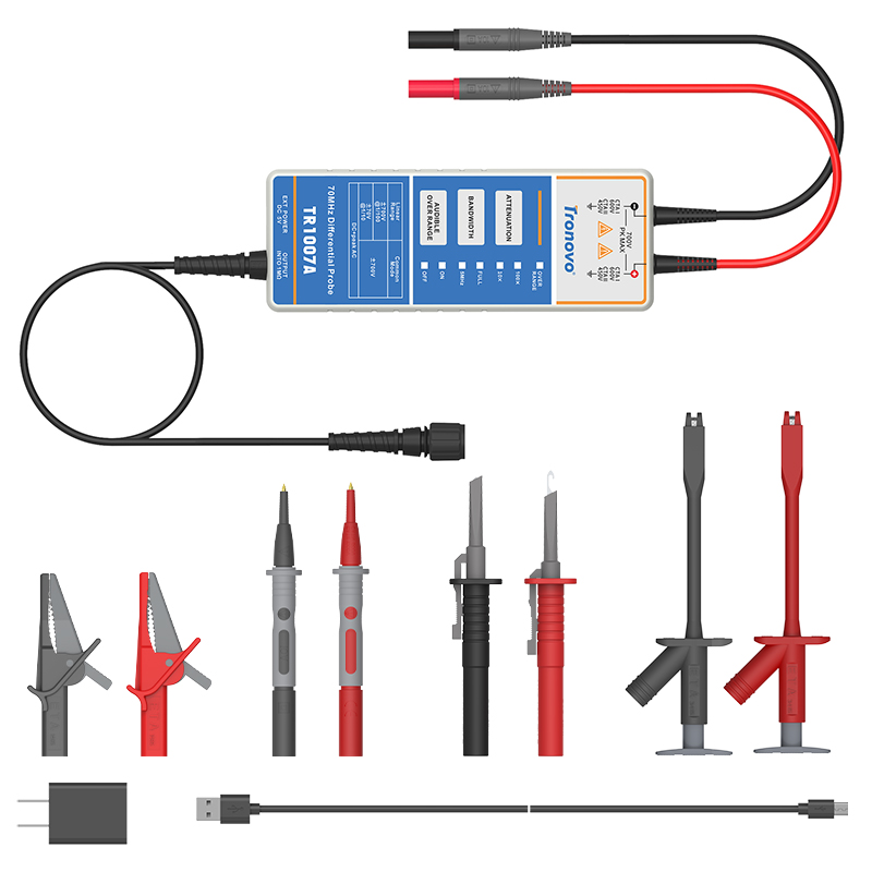 TR1007A高壓差分探頭適用于所有市場(chǎng)主流示波器,將浮動(dòng)信號(hào)轉(zhuǎn)換為參考地電平的低壓信號(hào),任何參考地電平的示波器都可以安全且簡(jiǎn)便地顯示。探頭使用頻率高達(dá)70MHz,可用于700V的電壓信號(hào),具有較高共模抑制能力,是進(jìn)行非地參考、浮動(dòng)或隔離測(cè)量很好的選擇。埃用示波器差分探頭非常適合電力測(cè)試、開關(guān)電源、逆變器、電機(jī)驅(qū)動(dòng)控制、開關(guān)電源研發(fā)、維修評(píng)估使用。